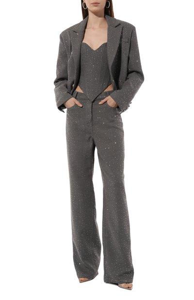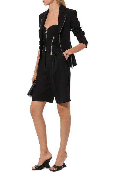 Корсет с экстремально глубоким фигурным декольте сшили из шерсти, усиленной полиэстером. Топ застегивается на потайную молнию сзади.