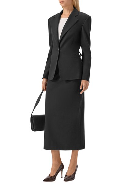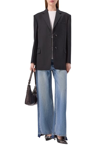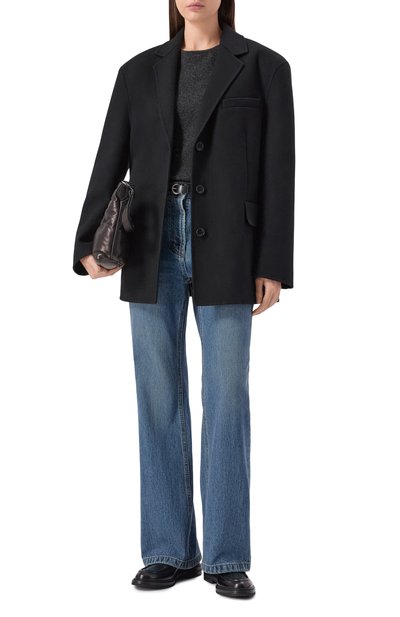 Однобортный жакет силуэта oversize сшили из костюмной ткани на основе шерсти первого пострига и полиэстера. Модель с прямоугольными лацканами дополнили тремя внешними карманами и еще одним внутренним.