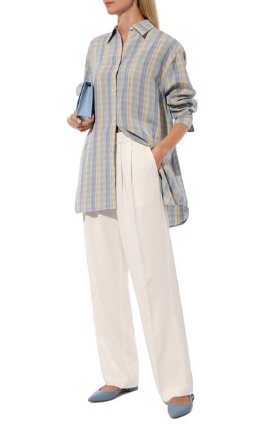 Рубашку со свободной удлиненной спинкой сшили из поплина с персиковой фактурой. Ткань выполнили из органического хлопка. Модель хорошо ладит с джинсами и туфлями или с брюками и балетками.