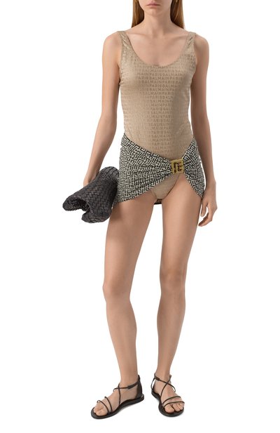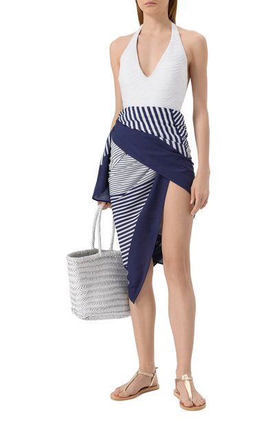 Широкое прямоугольное парео изготовили из полупрозрачного органического хлопка. Модель украсили крупной контрастной эмблемой бренда, подчеркнув края короткой бахромой.