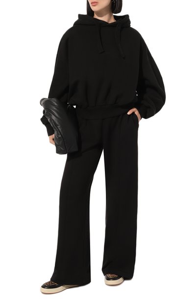 Свободное худи со спущенной линией плеч сшили из плотного хлопкового трикотажа френч терри с махровой изнанкой. Спереди модель украсили небольшим рельефным логотипом бренда в тон.