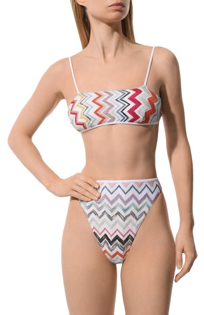 Плавки-бикини высокой посадки выполнили из шелковистого джерси. Широкий пояс с драпировками украсили крупной съемной брошью-цветком из такого же мате риала.