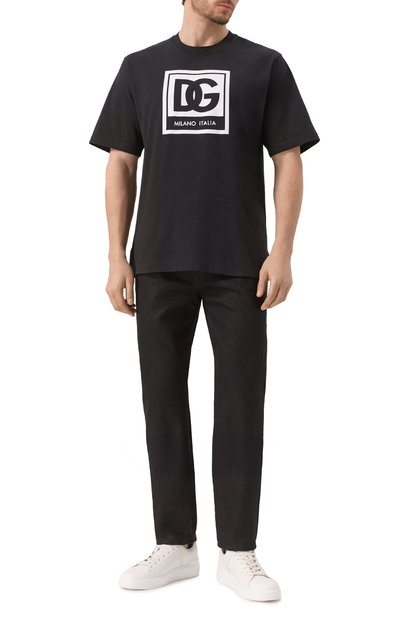 Аппликацию в виде эмблему марки на хлопковой футболке выполнили из сетчатого текстиля и вышили под ней логотип. Свободную модель можно носить не только на голое тело, но и поверх лонгслива.