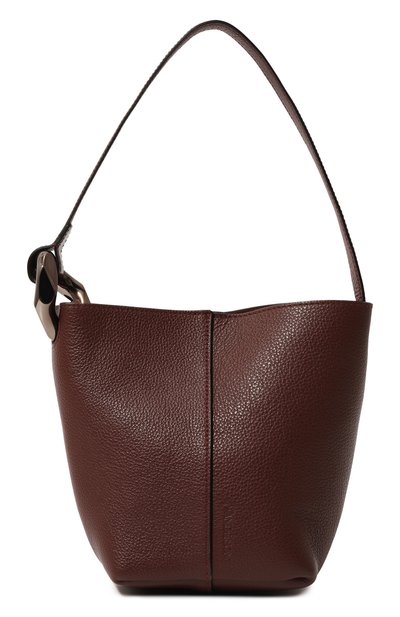 Небольшую сумку-ведро Corner Bucket изготовили из матовой крупнозернистой кожи, а для внутренней отделки выбрали замшу. Лаконичная модель с ручкой, которую с одной стороны дополнили крупным металлическим звеном цепи, закрывается магнитной кнопкой.