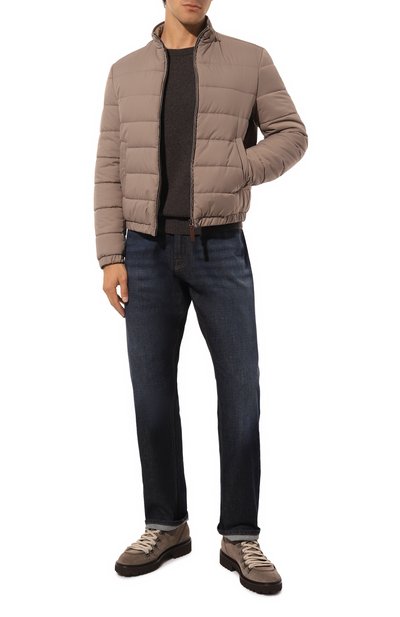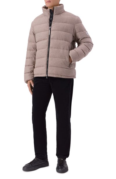 Бомбер с горизонтальным стеганым узором и трикотажными манжетами и низом сшили из габардина на основе кашемира и нейлона. Куртку, утепленную переработанными утиными пухом и пером, дополнили воротником-стойкой, тремя внешними и одним внутренним карманами.