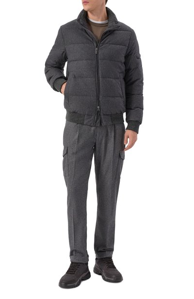 Стеганый меланжевый бомбер утеплили слоем утиного пуха с небольшим добавлением пера. Для пошива модели на встречной молнии использовали фактурный материал на основе кашемира. Изделие дополнено функциональными боковыми карманами, а также врезными на рукаве и внутри.