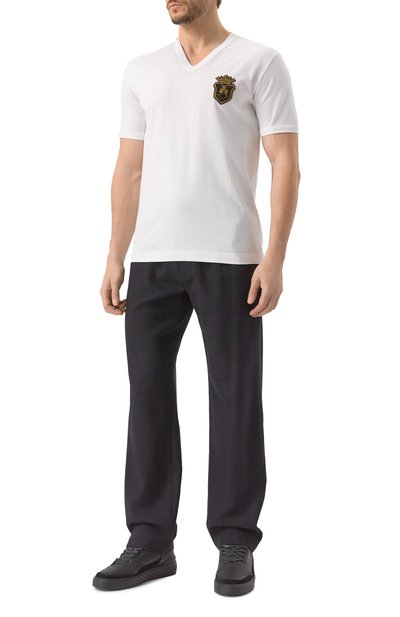 В коллекцию Re-Edition вошла футболка из хлопкового джерси с флокированным паттерном из монограммы DG. Наши стилисты предлагают сочетать модель прямого кроя с шортами и шлепанцами.