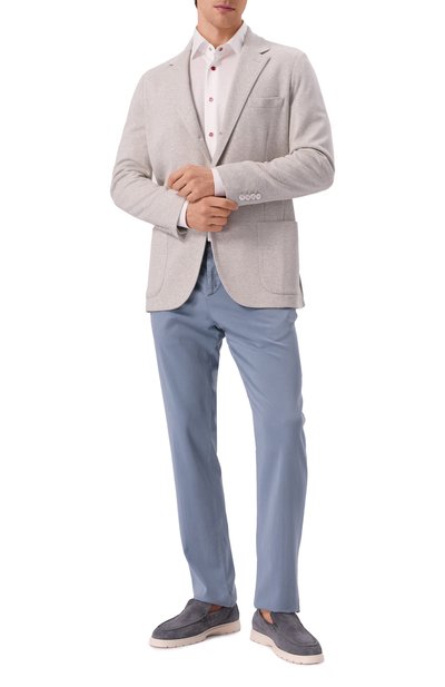 Однобортный шерстяной пиджак с прямоугольными лацканами дополнили внутренним и тремя внешними накладными карманами. Модель с фирменными пуговицами и строчками AMF по краям подружится в образе и с непарными брюками, и с джинсами.