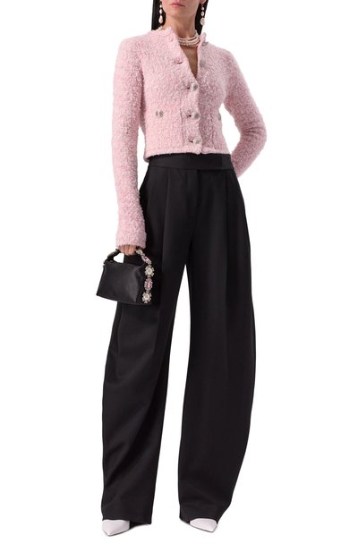 Укороченный кардиган сшили из эластичного хлопкового твида с добавлением блестящих нитей, создавших эффект «звездного неба». Модель с двумя карманами застегивается объемными пуговицами с рельефной монограммой BB.
