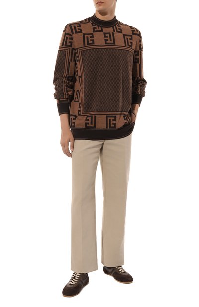 Свободный свитер со слегка спущенной линией плеч связали из шерстяной пряжи. Модель декорировали крупным логотипом и годом создания бренда, вышитыми нитями в тон.
