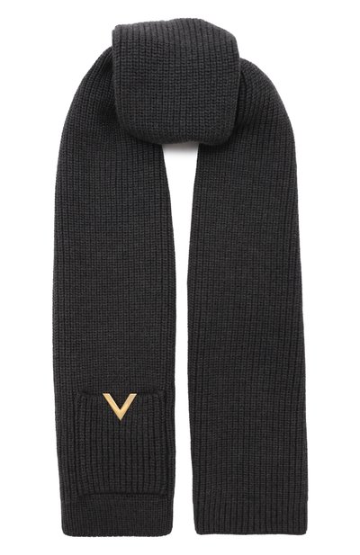 Этому шарф у добавили выразительности с помощью накладного кармана, украшенного золотистой литерой V. Аксессуар связали из шерстяной пряжи средней плотности.