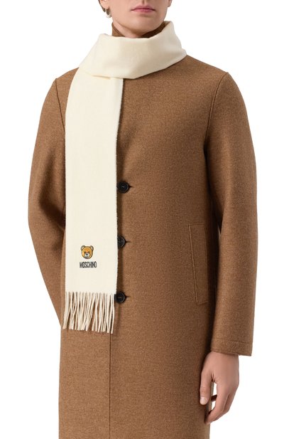 Для изготовления шарфа с короткой бахромой на концах и жаккардовым паттерном в виде логотипа использовали фактурную вискозу. Длины аксессуара хватит, чтобы завязать французский узел.