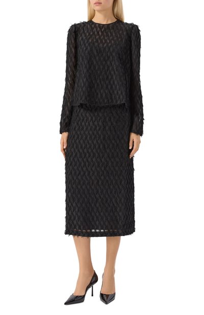 Юбку-карандаш длины миди выполнили из полупрозрачного гофрированного шифона с узором в тон. Модель с узким эластичным поясом предлагаем сочетать с боди, коротким жакетом и лаконичными туфлями.