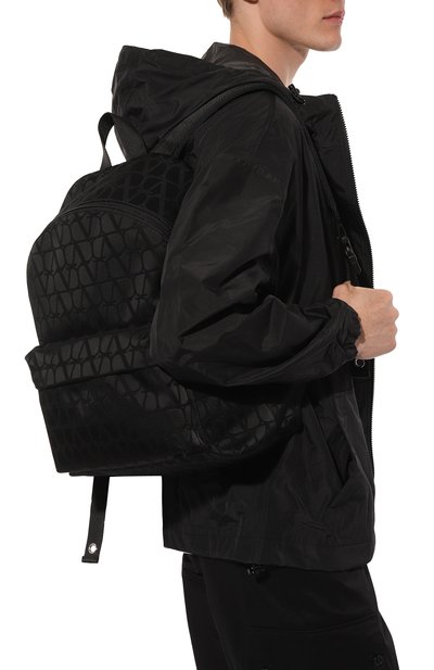 Рюкзак VLTN из нейлона дополнили отделением для ноутбука и объемным внешним карманом на молнии, украшенным контрастной аббревиатурой. Декор поддержали жаккардовым паттерном на короткой ручке и регулируемых лямках.