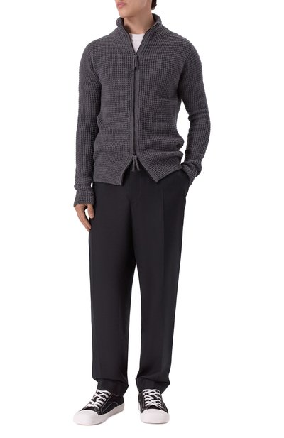 Кардиган с фирменной петлей на спинке выполнили из шерсти мериноса фактурной вязкой. Пояс сзади, манжеты, нагрудный карман и планки, прикрывающие встречную молнию, сделали более гладкими.