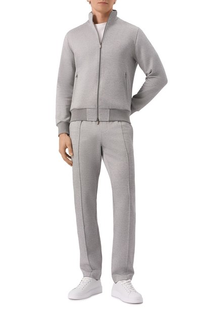 Для пошива толстовки с двумя врезными карманами и регулируемым капюшоном использовали трикотаж на основе хлопка и шерсти. Модель в мелкую полоску, застегивающаяся встречной молнией, удачно впишется в повседневный образ.