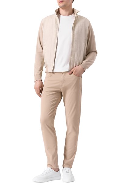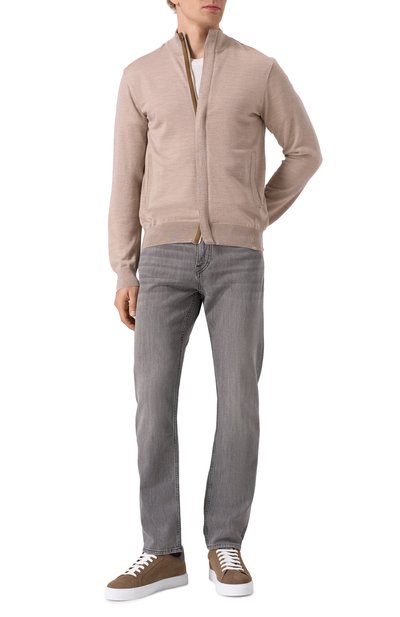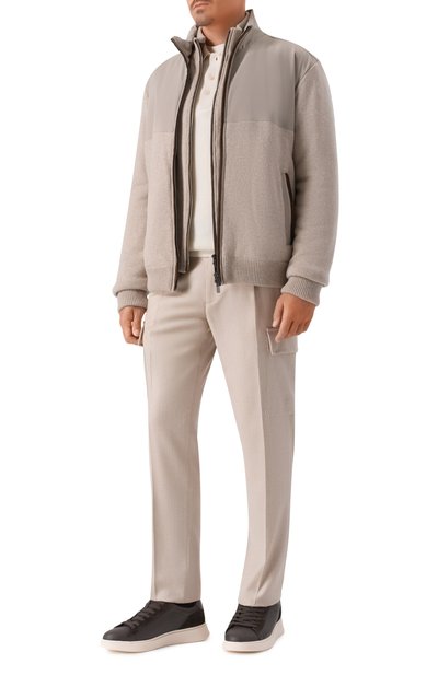 Кардиган изготовили из хлопка с добавлением шерсти, выполнив основную часть из гладкого трикотажа, а рукава — из фактурного. Модель с двумя карманами и высоким воротником украсили сзади небольшой брендированной пластиной.