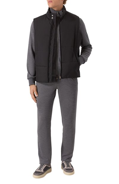 Для создания меланжевого кардигана использовали трикотаж из хлопка и шерсти. Модель с двумя врезными карманами и рукавами в рубчик застегивается встречной молнией. Сзади — небольшая брендированная пластина.