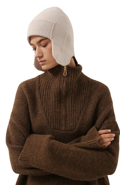 Эластичный капор с рельефными узорами связали из смесовой шерстяной пряжи с добавлением вискозы. Аксессуар с разрезами по бокам декорировали мерцающими пайетками. Модель может стать хорошей альтернативой шапке и шарфу.