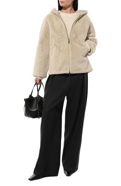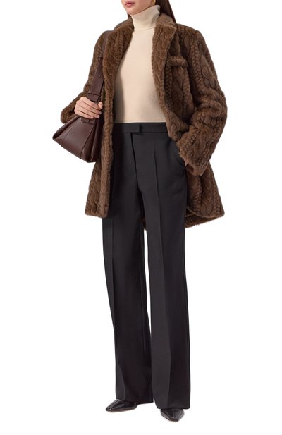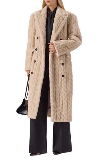 Для создания шубы с широкими лацканами использовали экомех, напоминающий овчину. Модель с двумя врезными карманами и атласным вискозным подкладом застегивается на потайную кнопку.