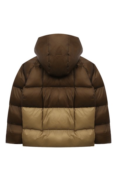 Для пошива стеганой утепленной куртки с объемным капюшоном и высоким воротником-стойкой использовали гладкий легкий нейлон. Модель с двумя врезными карманами украшена небольшой эмблемой в виде тотемного орла внизу и крупным термопринтом с символикой марки сзади.