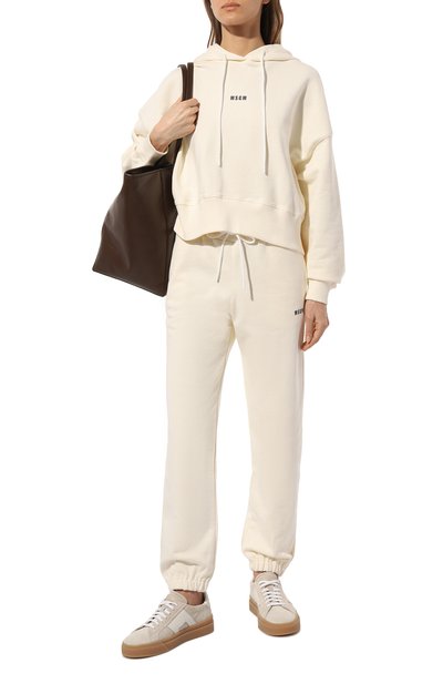 Джоггеры сшили из эластичного трикотажа на основе полиэстера с добавлением мягкой вискозы. Широкий пояс обеспечивает комфортную посадку на талии и не давит на живот, поэтому модель подойдет и для беременных.