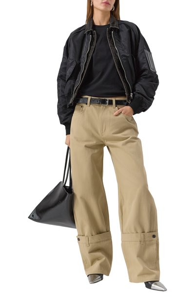 Расклешенные джинсы с заниженной посадкой сшили из денима, который соткали из органического хлопка. Модель с пятью карманами покрыли аэрозольной краской и отшлифовали вручную для получения уникальных полутонов, что в сочетании с активными искусственными потертостями создает состаренный эффект.
