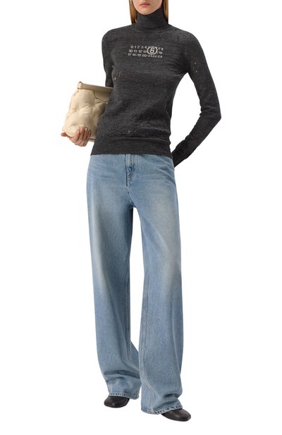 Облегающую водолазку с разрезами по боками выполнили из тонкого полушерстяного трикотажа, который сделали еще мягче кашемиром в составе. Рукава удлинили, поэтому они ложатся снизу объемными складками.