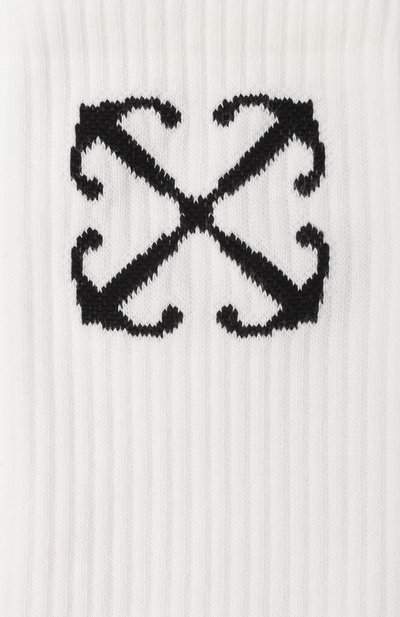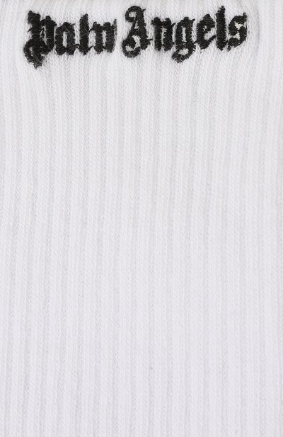 Носки с высоким рифленым паголенком выполнили из хлопка, усиленного нейлоном и эластаном. Подошву декорировали контрастными жаккардовыми мотивами в виде логотипа марки и названия коллекции.