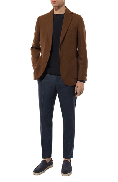 Зауженные брюки со стрелками выполнили из фактурной шерсти. Модель с широким регулируемым поясом-кулиской дополнили двумя прорезными карманами по бокам и еще одним сзади.