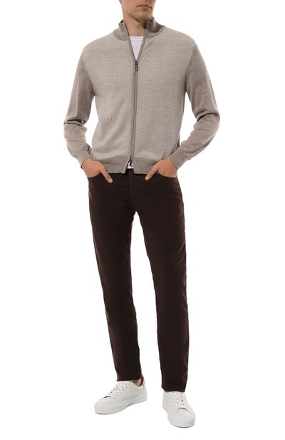 Эластичные брюки со стрелками сшиты из мягкой шерсти с клетчатым микроузором. Модель дополнена парой боковых карманов и двумя задними. Наши стилисты предлагают носить изделие с джемпером, кардиганом и лоферами.