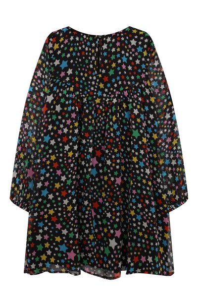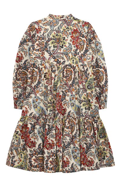 Платье со складками на лифе сшито из тонкой ткани с цветочным брендированным принтом. Модель с длинными рукавами и многоярусным подолом застегивается на пуговицы сзади.
