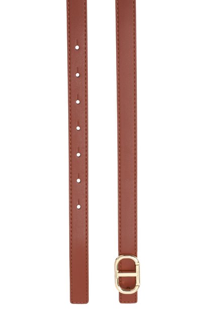 Узкий ремень изготовили из материала, напоминающего мелкозернистую телячью кожу. Аксессуар с кобурной кнопкой декорировали крупной кристальной пряжкой.