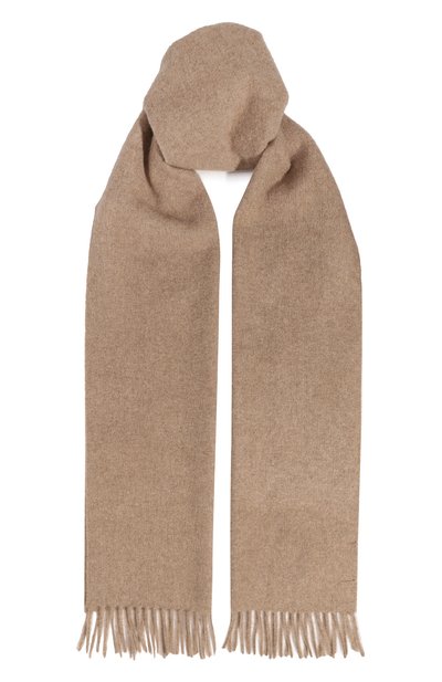 Широкий шарф изготовили из меланжевой кашемировой ткани. Лаконичный аксессуар с длинной бахромой впишется в образы любой степени формальности.