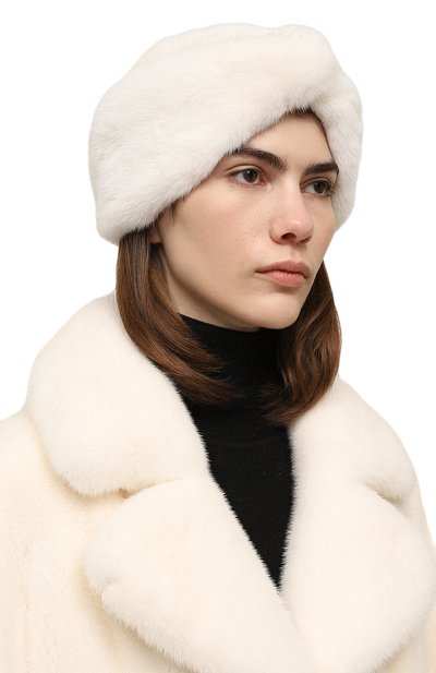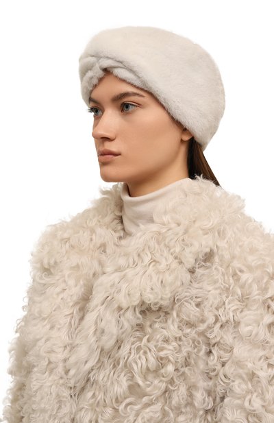 Шапку бини с регулируемым отворотом украсили помпоном из меха песца в тон. Однотонный аксессуар связали в технике резинки из кашемировой пряжи.
