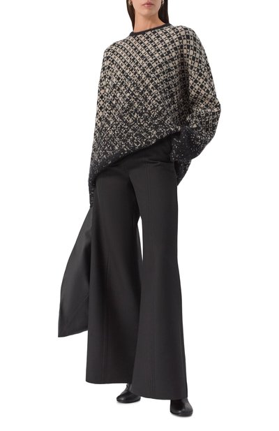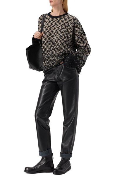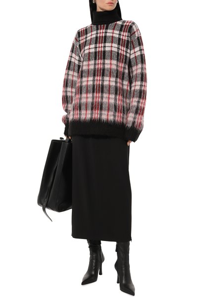 Свитер с ворсованной отделкой снизу выполнили из смесовой пряжи на основе акрила и переработанного нейлона. Манжеты, ворот и пояс модели с клетчатым узором сделали однотонными.