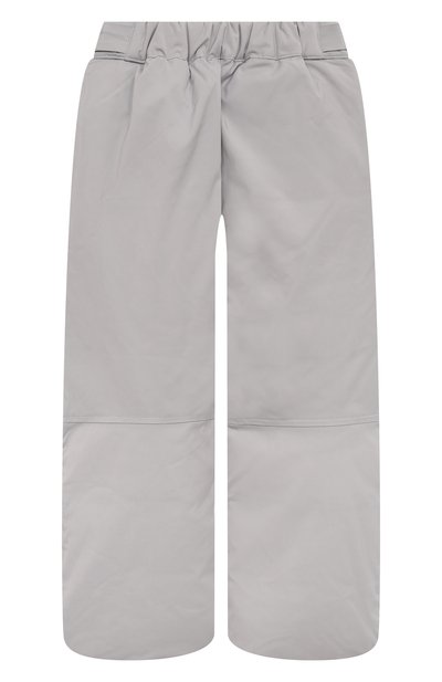 Брюки из полиэстера утеплили флисовым подкладом и утиным пухом с добавкой пера. Пояс с эластичной вставкой дополнили ремешками с велкро, снизу брючин предусмотрели манжеты и молнии. По бокам — врезные карманы.