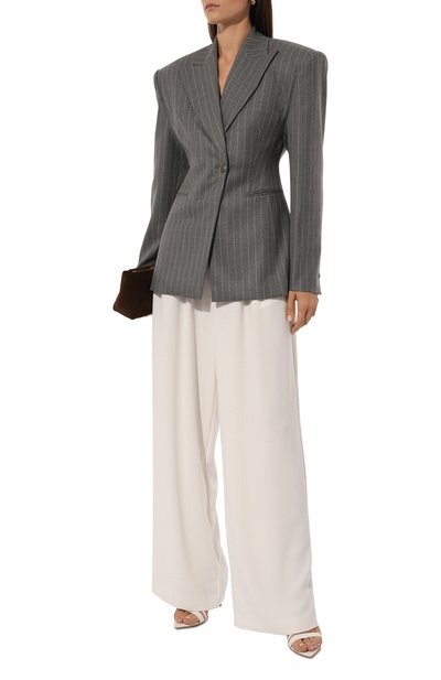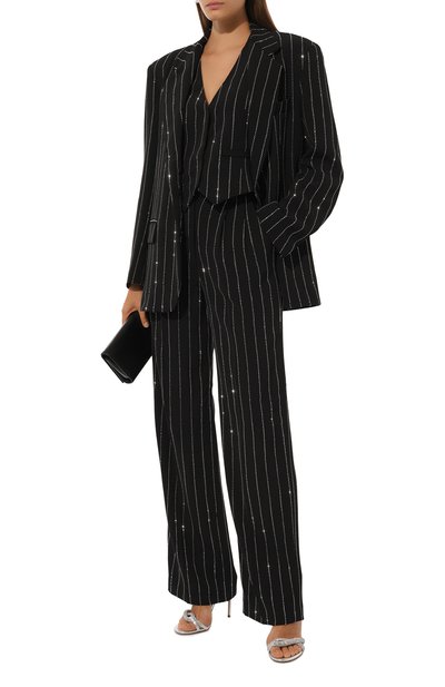 Однобортный жакет с заостренными лацканами и двумя карманами выполнили из фланели на основе шерсти. Полосатый мотив подчеркнули пайетками. Предлагаем сочетать модель с парными брюками и босоножками.