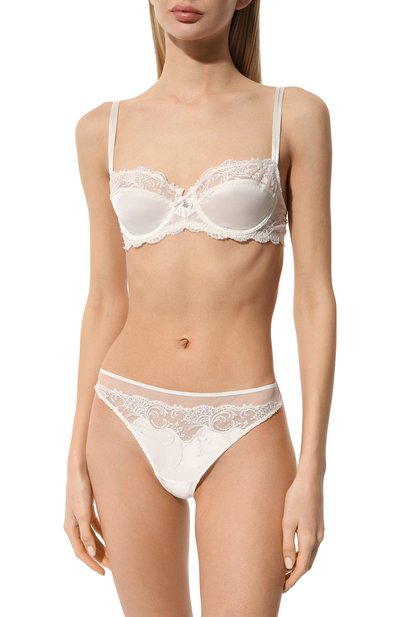 Слипы с фигурным вырезом спереди сшиты из комбинации полупрозрачного тюля и мягкого джерси. Атласные ремешки и широкие эластичные ленты по бокам дополнены слайдерами, покрытыми 24-каратным золотом.