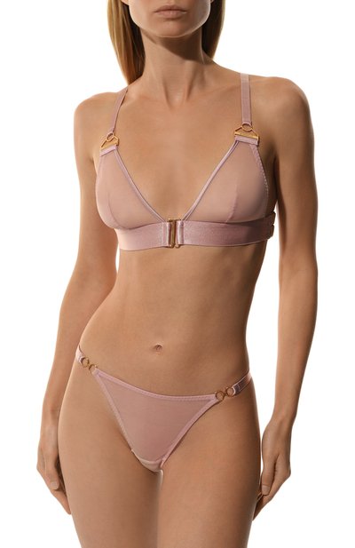 Стринги с узкими ремешками сшиты из комбинации шелкового атласа и тонкого тюля. Слайдеры и кольца, соединяющие детали, покрыты тонким слоем 24-каратного золота.