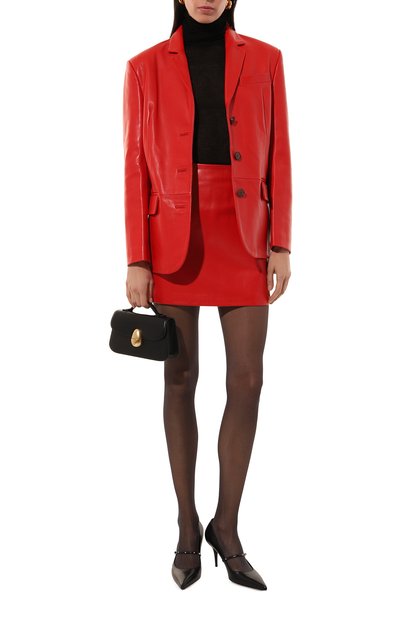 Однобортный жакет из оранжевого вельвета с подплечниками дополнили шелковистым вискозным подкладом. Кроме накладных боковых карманов, предусмотрели врезной нагрудный.