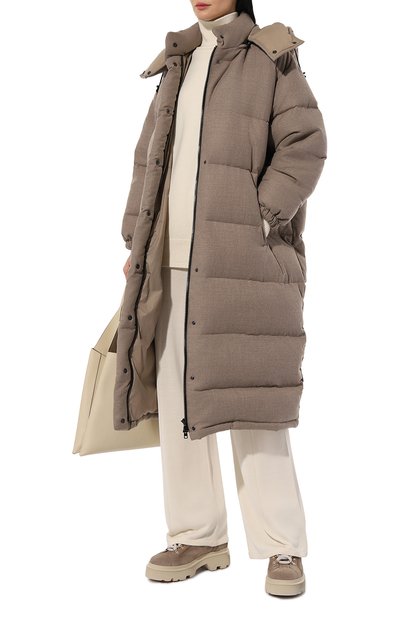 Стеганый пуховик Eza из влагостойкого нейлона обеспечит комфорт при температуре от -25°C до 10°C. Пальто на утином пуху дополнили боковыми карманами и внутренним поясом-кулиской. Отделку из меха кролика на капюшоне можно отстегнуть.
