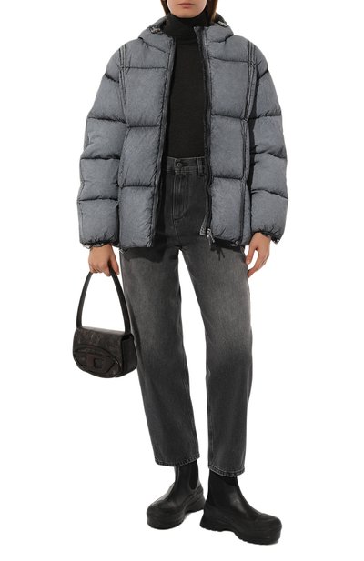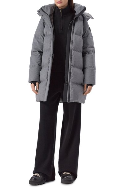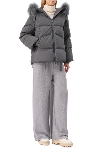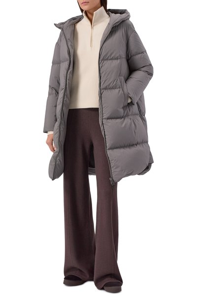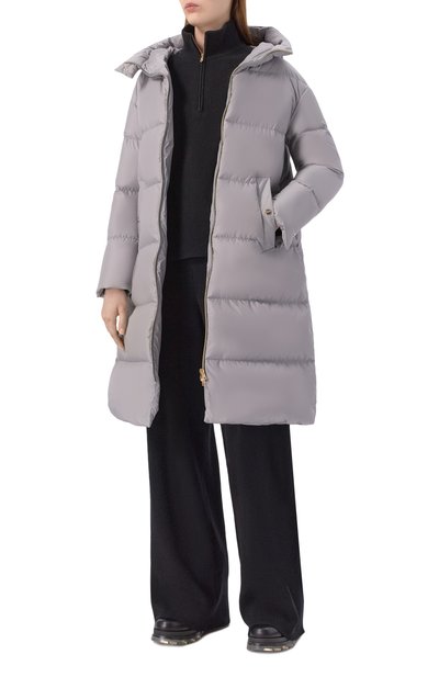 Для пошива стеганого пальто Nev на утином пуху использовали влагоотталкивающий нейлон. По бокам предусмотрели два прорезных кармана. Модель на молнии, скрытой под штормовой планкой с кнопками, дополнили капюшоном со съемной отделкой из меха кролика.