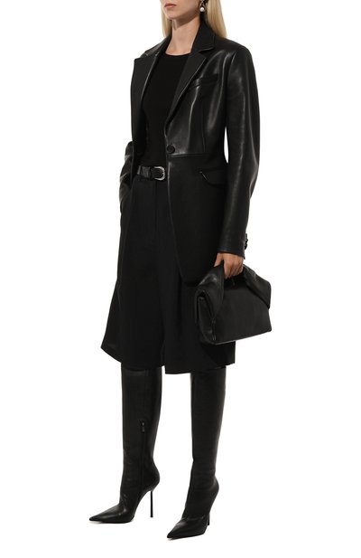 Однобортный жакет с широкими лацканами и врезными карманами сшит из эластичной шерстяной фланели с кашемиром. Приталенная модель с полуподкладом и высокой шлицей застегивается на пуговицы.