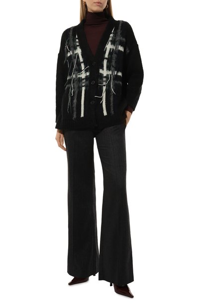Кардиган с глубоким V-образным вырезом выполнили из шерстяного трикотажа с абстрактным мотивом. Крупные карманы спереди и края изделия свободного кроя акцентировали серым кантом.