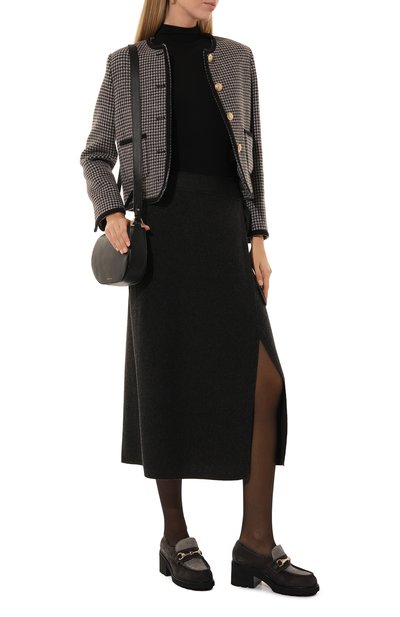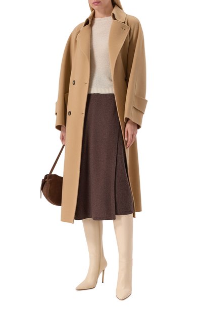 Юбку с запахом, завязывающимся лентами сбоку, дополнили широким поясом. Эластичную модель с отделкой в рубчик сшили из шерстяного трикотажа с добавлением кашемира и вискозы.