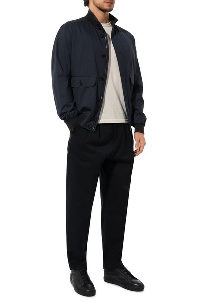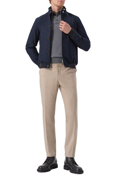 Бомбер из плотного хлопкового трикотажа дополнен внутренним карманом и двумя внешними с клапанами. Воротник-стойка, манжеты и широкий пояс выполнены в резинку. Эластичная куртка застегивается на пуговицы.