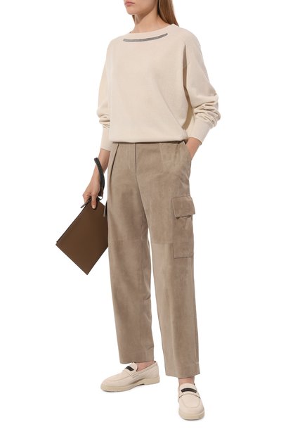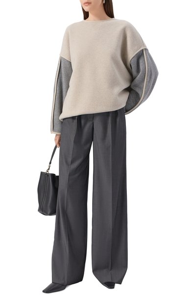 Пуловеру из кашемира добавили сияния, украсив широкий кант круглой горловины рядами цепочки мониль. Свободная модель со спущенной линией плеч дополнит образ в светлых тонах с вельветовыми брюками и жакетом.
