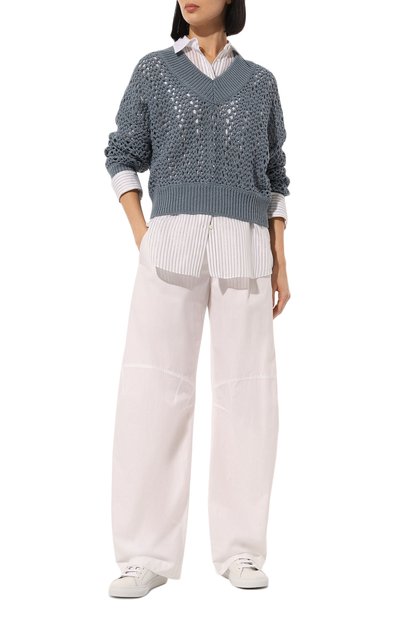 Название пуловеру Dazzling Net дал сетчатый узор с пайетками, который оттенили плотными матовыми полосами. Наши стилисты предлагают носить ажурную модель из шерсти и мохера поверх рубашки.
