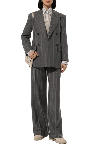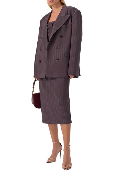 Двубортный пиджак с заостренными лацканами сшили из шерсти мулине в меловую полоску. Модель с четырьмя карманами и двумя шлицами сзади застегивается роговыми пуговицами. Горловину сзади украсили цепочкой мониль.